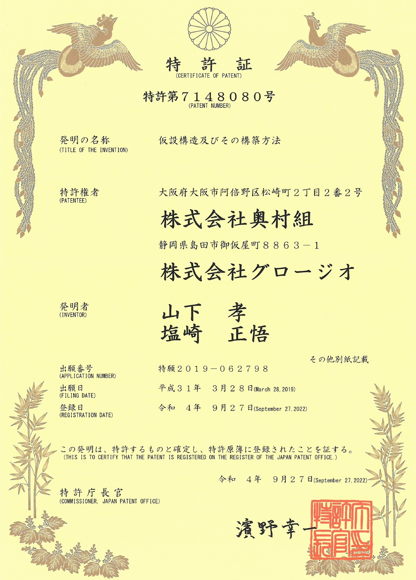 2022.11.09 「仮橋又は仮桟橋の仮設構造」についての特許を取得しました