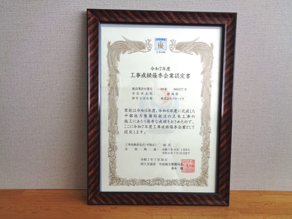 令和5年度、令和6年度に完成した土木工事の 施工に於いて優秀な成績をおさめたことから 令和7年度「工事成績優秀企業」に認定されました。