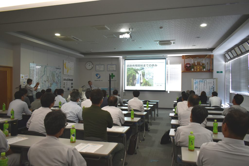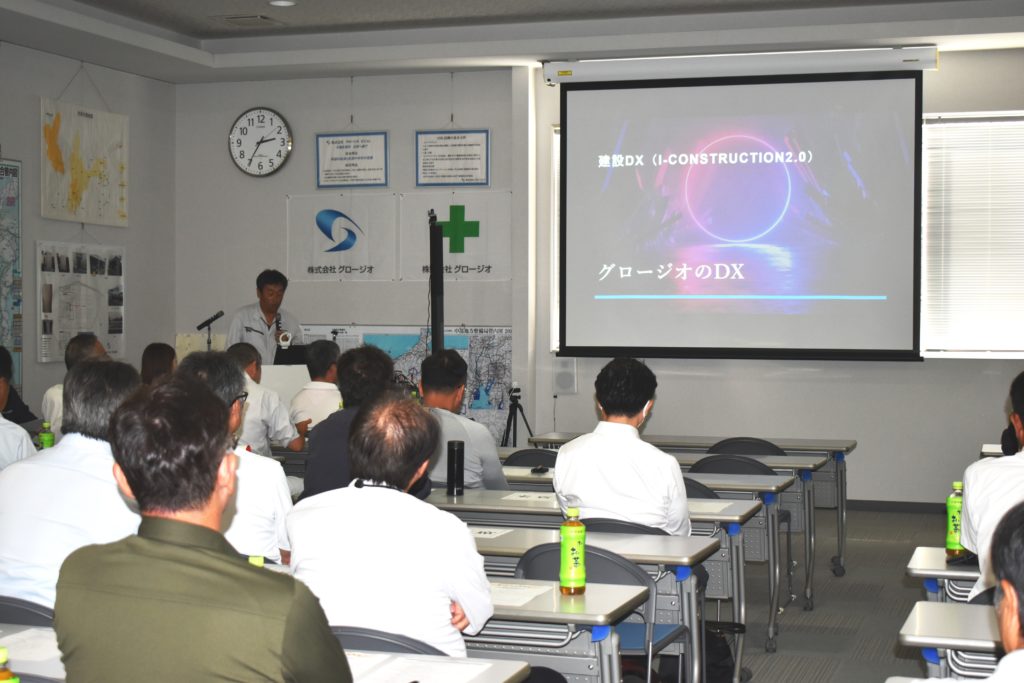 今回は、テーマを色々と変えて「グロージオDX」「QRコードを使った地元住民へのお知らせ」「工期短縮のアイデア」等5現場の発表をしてもらいました。