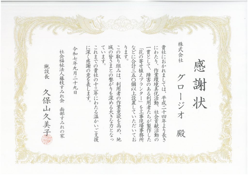 南部すみれの家より感謝状をいただきました